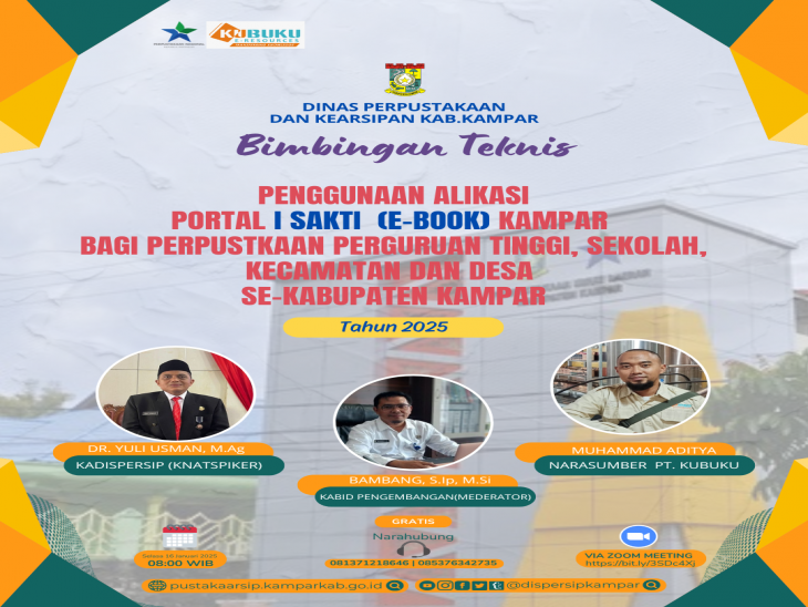 Bangkinang- Mendapatkan informasi adalah hak Asasi manusia yang sudah dijamin dalam Undang- Undang Dasar 1945 yang tertuang dalam pasal 28 F, untuk itu Dinas Perpustakaan dan Kearsipan (Dispersip) Kabupaten Kampar selaku Dinas yang memberikan layanan publik dalam memberikan informasi dan ilmu pengetahuan dalam menunjang peningkatan literasi masyarakat hari ini (Kamis, 16/01/2025) mengadakan Zoommeeting tentang petunjuk tekhnis Aplikasi Portal I-Sakti Kampar yang merupakan aplikasi hasil dari inovasi Dispersip Kampar.